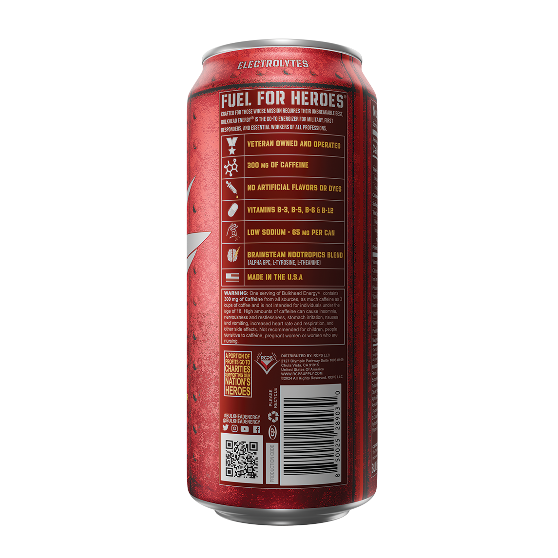 Bulkhead Energy is the sole military-branded energy drink in the market that is veteran-owned and operated. Our beverage boasts high-quality ingredients and a formulation created by our in-house chemist. Each of our drinks is sugar-free, calorie-free, and enriched with electrolytes, vitamins B-3, B-5, B-6 and B-12, natural flavors, no artificial dyes, and low sodium, all while delivering great taste. We also utilize our own branded nootropics blend, BRAINSTEAM™, to boost cognitive brain function during crucial moments requiring attention and focus. We tailor our products to meet the needs of our target audience comprising military personnel, first responders, and essential workers.